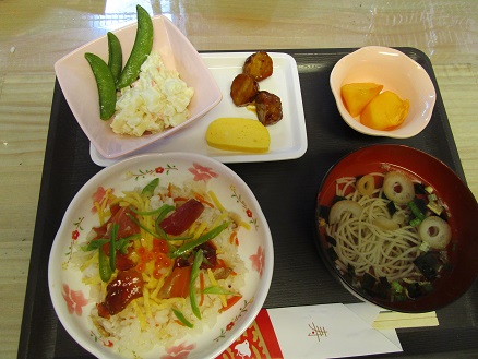 昼食はちらし寿司などなど、おやつでは白の饅頭と赤の洋風蒸し饅頭を召し上がって頂きました(^^♪
