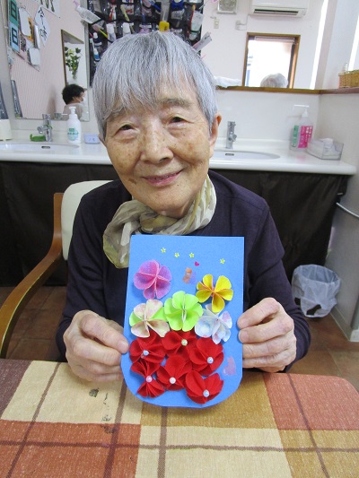 手工芸では、折り紙などで作ったお花を色紙に貼り
