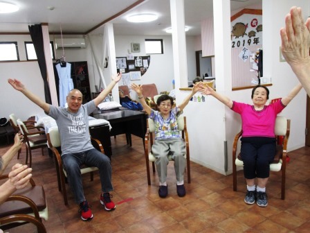 リズム体操では365歩のマーチに合わせて手や足を動かしました。