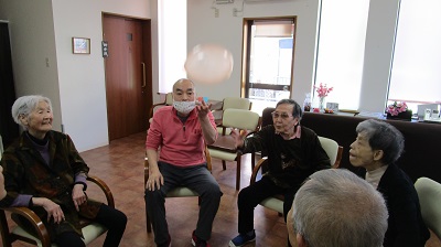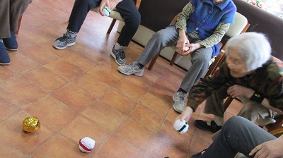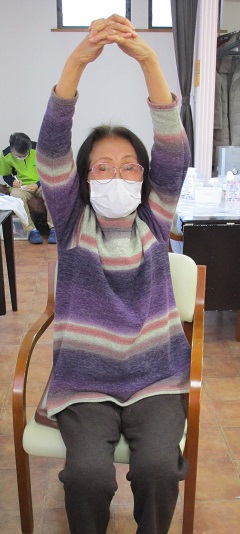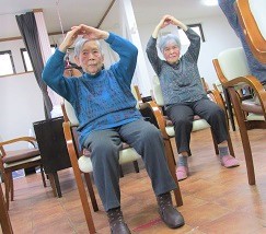 イス体操やボールストレッチでは職員と一緒に