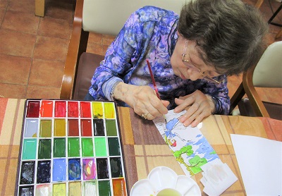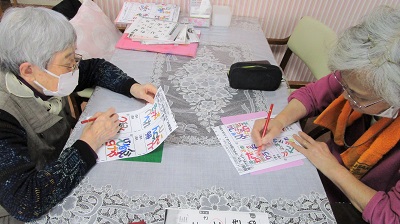 今日のレクの絵画教室では、絵手紙に色を塗りました。