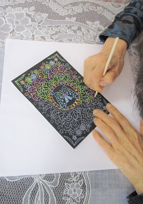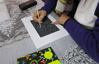 別テーブルでは、新しいタイプのスクラッチアートに取り組んでいる方も。なかなか根気のいる作業でした。