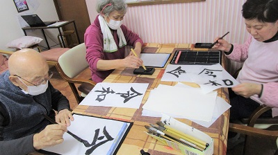 書道では「令和」のお手本を見ながら黙々と…