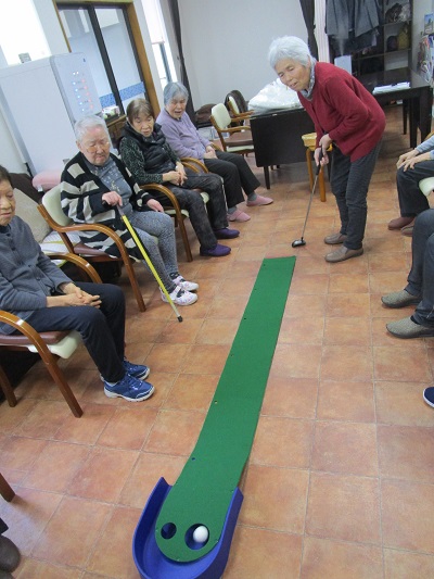 今日のレクはパターゴルフ・ジェスチャーゲーム・コロリアージュ
