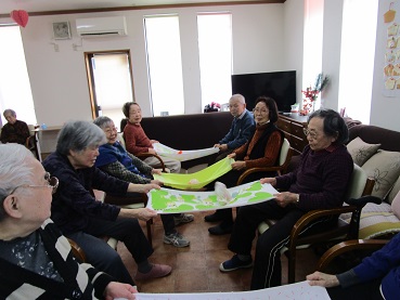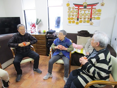 個別ケアでは3名の方が協力し、折り紙でくす玉を完成しました。