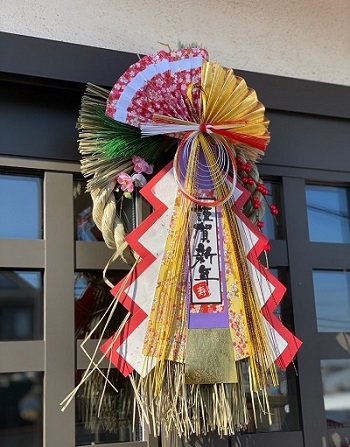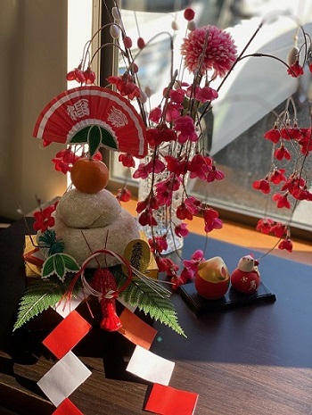 1月3日沢山の花々を飾り、玄関先ではお正月飾りが