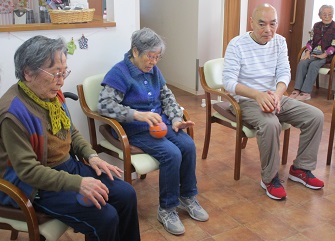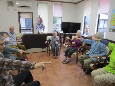 午後のレクは外気浴でしたが日陰になり涼しくなってきたので 手指体操を行いました。