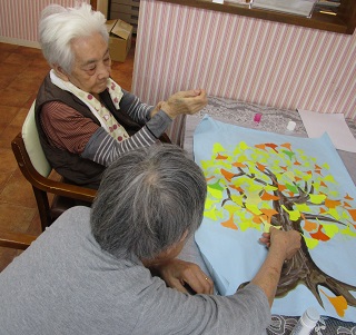 手工芸では、折り紙などで作ったお花を色紙に貼り