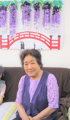 掲示物「藤の花」と同じ色合いの服装のお客様がおられ